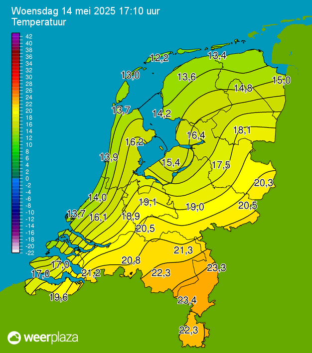 Temperatuur nu tussen 12,2 graden op Vlieland en 23,4 graden in Ell: