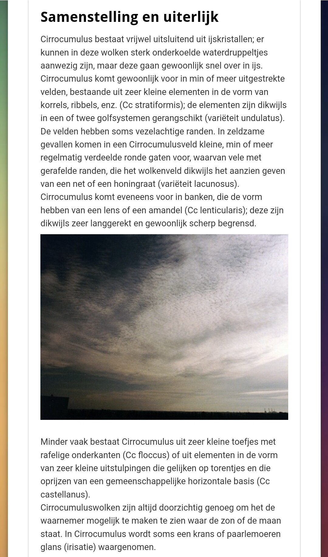 Echter was hier vrijwel alleen maar hoge bewolking. Rond 14.30 uur ook even middelbare bewolking, maar dat waren een gering aantal Cumuli. In Cirrocumulus is irisatie en een krans om de zon zeker mogelijk, zie onderstaande link met wolkenatlas.