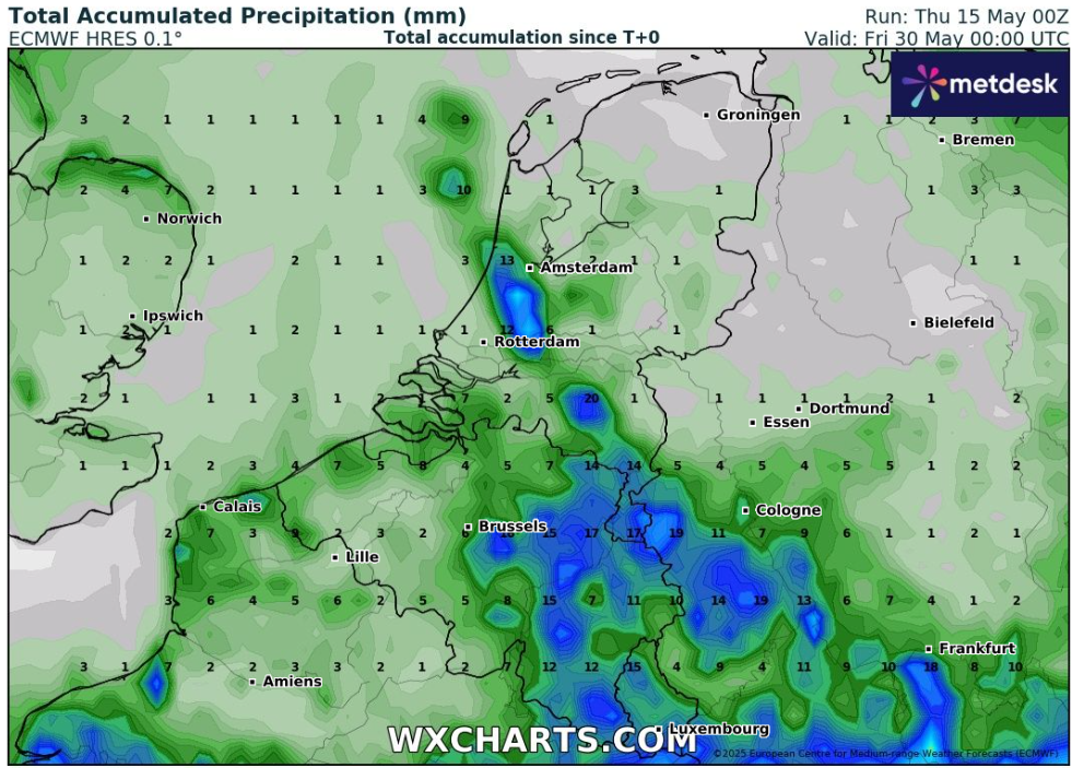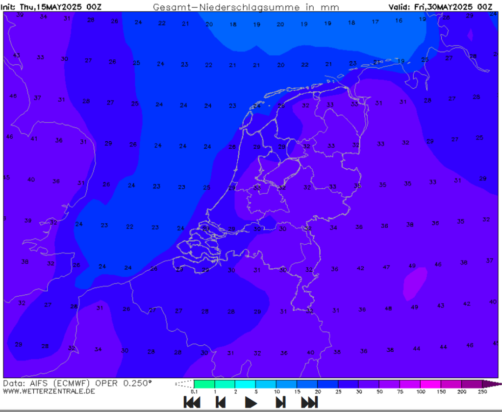 ECMWF: Zo/Ma een paar stevige buien, verder droog en op ULT erg warm