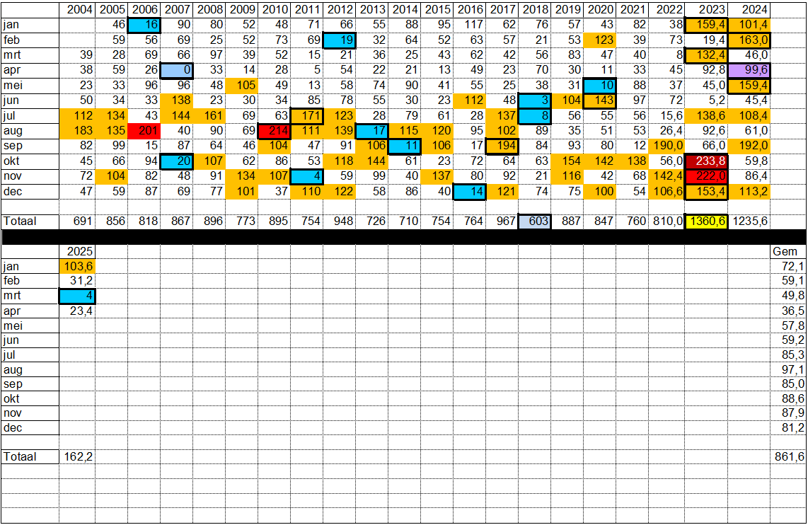 Aflopen 2 kalenderjaren respectievelijk 1360,6 en 1235,6 mm gehad hier tegen een normaal van zo'n 860 mm.