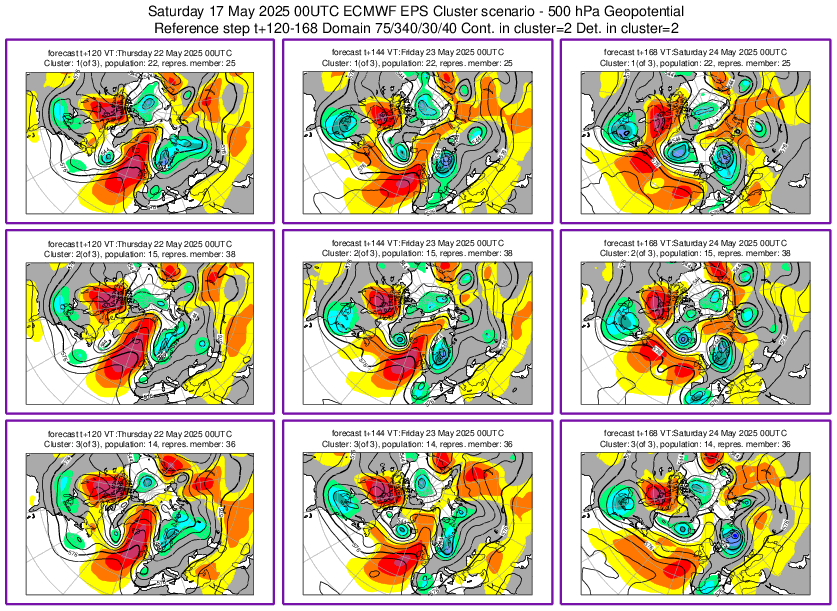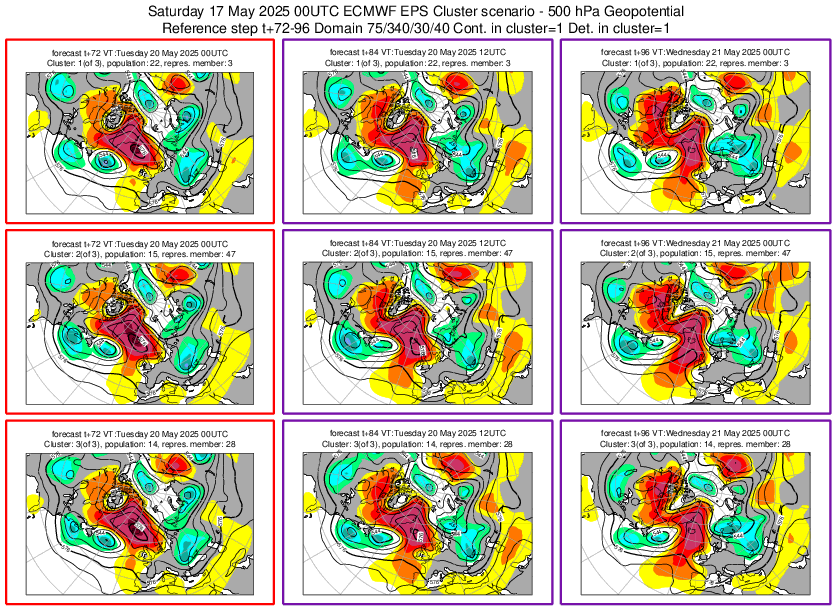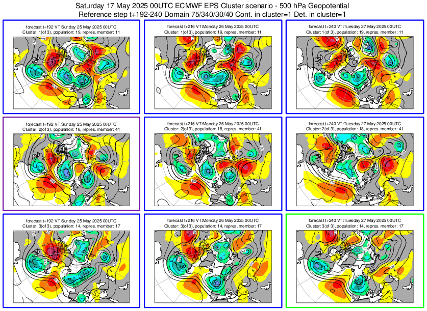Hier zie je voorlopig het einde van de rode Scandinavië-BLOCK situatie en gaan we naar het paarse ATR (Atlantic Ridge) scenario. Is nog steeds een volledig geblokkeerde setting. Hogedruk vanaf IJsland tot bij de Azoren. Maar dus duidelijk zuidelijker / zuidwestelijker gelegen dan in de vorige BLOCK-situatie. Lagedrukgebieden vanaf de oceaan maken nog geen kans in deze periode. Wel zie je vanuit het poolgebied lagedruk midden- of oost Europa intrekken.