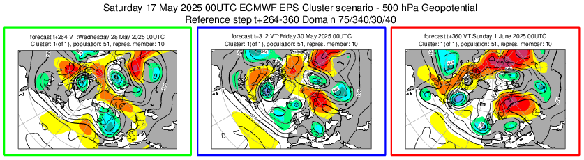 In de laatste reeks voor de laatste dagen van mei, en de 1e van juni zie je toch weer een opbouw van een krachtig hoog boven Scandinavië. Erg benieuwd of en in de dagen daarna ook in de Azoren-omgeving weer een hogedrukgebied gaat ontstaan. Als dat zo is, dan zou de 'natte' NAO+ periode ook zomaar weer ten eind kunnen komen.