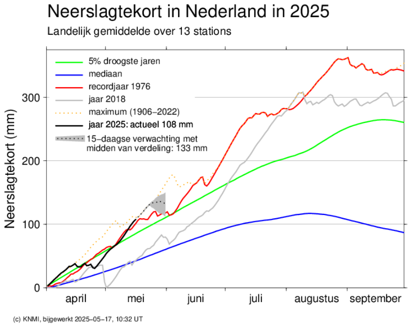 Extreme droogte zoals we nu hebben is nergens goed voor. Gelukkig buigt het lijntje van het neerslagtekort naar rechts af de komende 15 dagen. Maar het duurt nog wel even voordat we bij de blauwe lijn zitten.