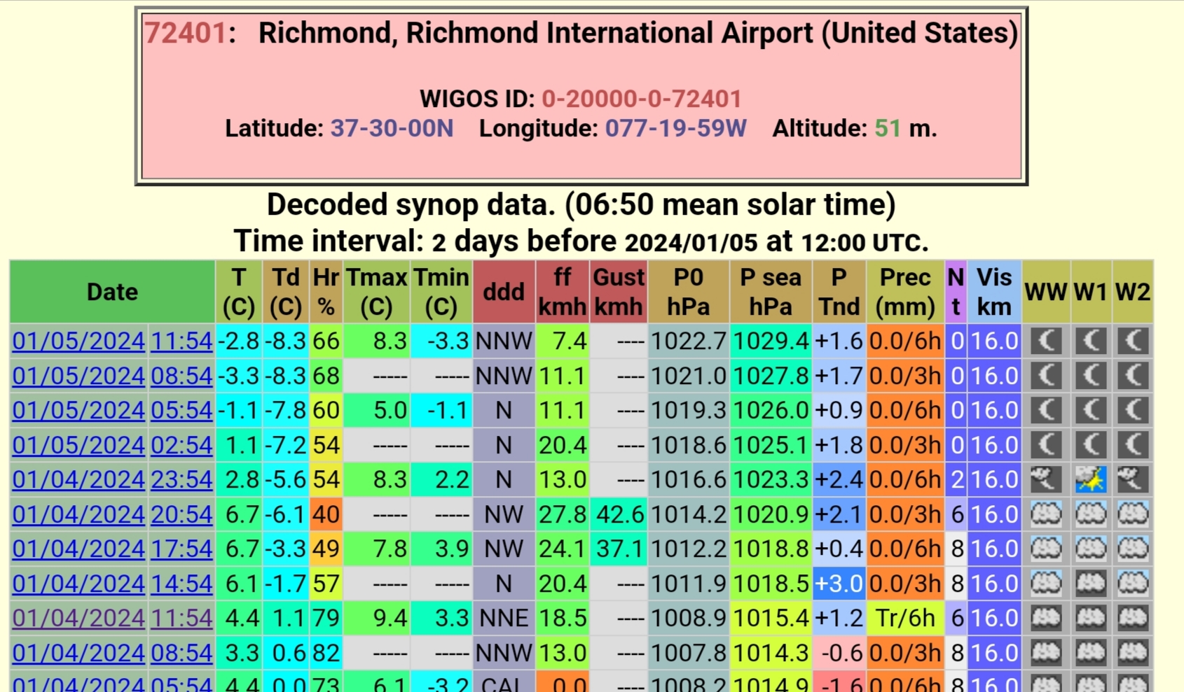Ik deel je bedenking wel. De luchtdruk is sowieso erg hoog en de gradiënt zwak. Op de 4e (utc) in Richmond komt de wind ook vanaf alle kanten en pas later op de dag zou je bij NW wat lijwerking kunnen ontdekken.