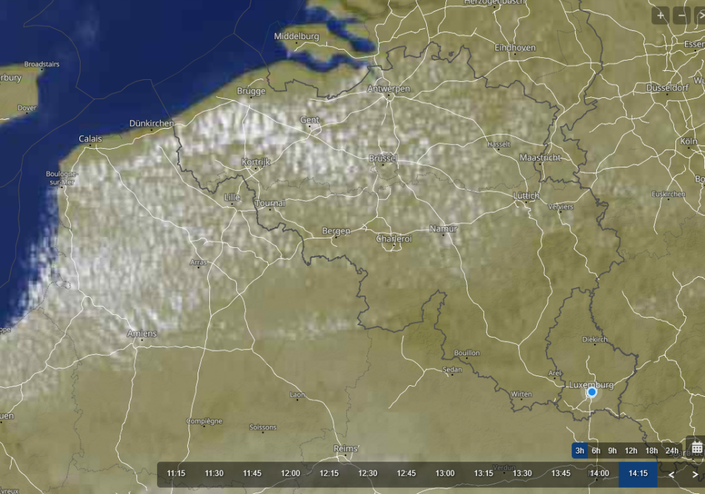 Vandaag is het na twee grotendeels bewolkte dagen weer uitgesproken zonnig. Boven Belgie en noord Frankrijk is op uitgebreide schaal cumulusbewolking te zien, en hier aan de rand daarvan zijn het een paar kleine wolkjes.