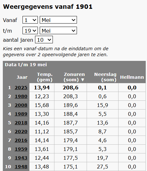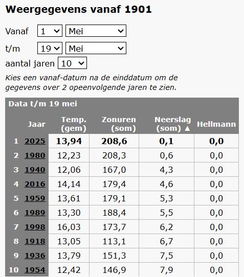 Voor de gemiddelde temperatuur een 14e plaats, kijk je alleen naar de maximumtemperaturen, dan een 9e plaats (gemiddelde Tx tot nu toe is precies 20,0 graden). Het neerslagtekort ligt inmiddels ook op recordniveau, en dat is dan nog zonder de recorddroge en -zonnige maand maart. De komende 1 - 2 weken mogelijk even stabilisatie van het neerslagtekort, al is de verwachting nog gebaseerd op de vorige pluim die gemiddeld 5 - 10 mm natter was.
