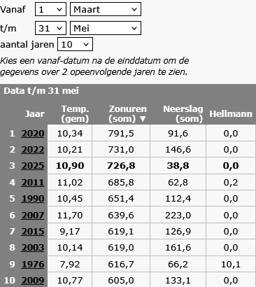 Voor de zonnigste lente sinds begin vorige eeuw zijn er nog 65 zonuren nodig, dat lijkt nog wel mogelijk. En nog steeds een kleine 22 mm voor de neerslag, wie weet kan dat ook nog. Straks wordt het beide een fotofinish....