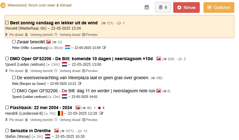 Om 13:34 plaatste Vincent (Westerhaar, Ov) een bericht met als titel: 'Best zonnig vandaag en lekker uit de wind'. Even later antwoordde ik daarop met 'Zwaar bewolkt', waarbij ik een paar foto's en een satellietbeeld plaatste. Na de laatste toevoeging bleek echter de hele draad verdwenen te zijn! Zoiets gebeurt een enkele keer meer, zonder aanwijsbare oorzaak, maar hoe kan dat nu? Ik had een tweede tab openstaan, en daarop staat het bericht nog. Vandaar dit screenshot: