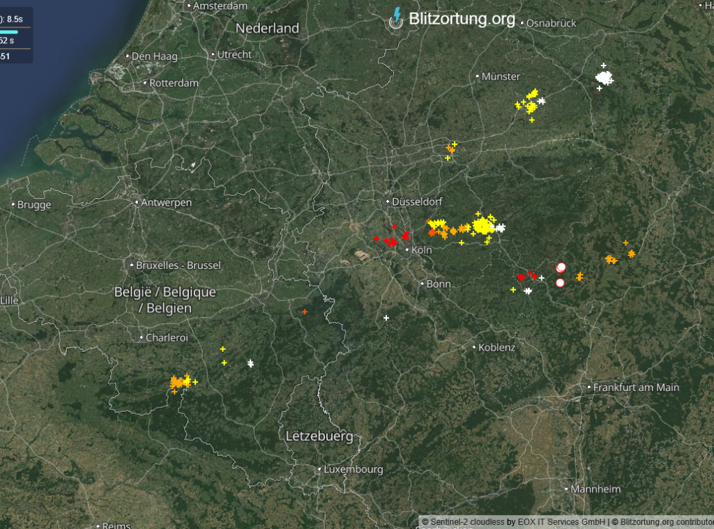 De weerkaart van het KNMI ziet er nu wat merkwaardig uit, met een koufront, op enige afstand gevolgd door een occlusiefront. In werkelijkheid liggen beide lijnen dichter bij elkaar. Op de westelijke lijn komen forse buien voor met wat onweer in de Ardennen, en verder naar het noordoosten ook in Duitsland. Grote dingen lijken er niet te gebeuren.