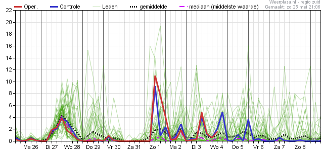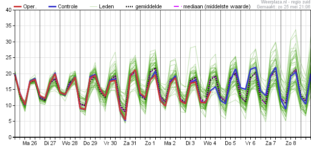Ook deze pluim blijft opvallend koel tov GFS en blijvend wisselvallig. Benieuwd wie aan het langste eind gaat trekken of het wordt een mooie tussenoplossing. AIFS12 kiest dan weer de warmere optie tov de vorige 2 runs voor volgende week zaterdag/zondag en erna, maar ook hier zeker geen optie tot tropische temperaturen op zaterdag 31/05 en blijvend onstabiel tot begin juni.