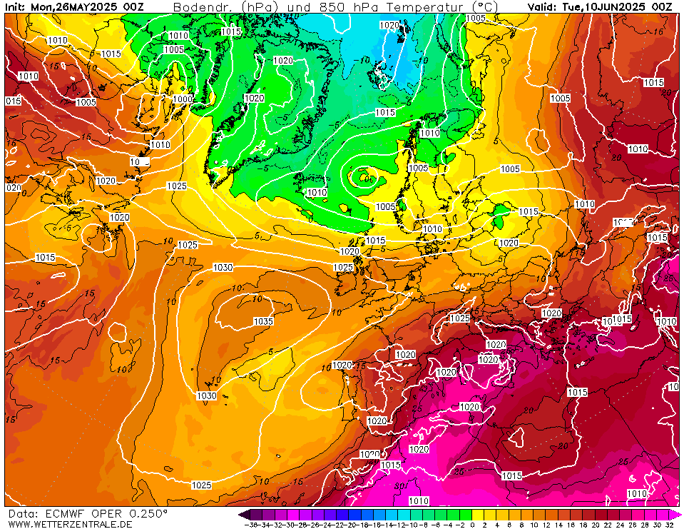Nu de run van de oper t/m 360u op WZ staat nog even gekeken naar de kaarten voorbij 240u. En ik weet, het is zeer speculatief een dergelijke termijn. Maar goed, we zien het richting Groenland opgerichte Azorenhoog op 240u in de kaarten erna langzaam "platgeslagen" worden naar het Europese vasteland en op de allerlaatste kaart ontstaat er boven centraal Europa ook een aparte hogedrukkern. Gezien de evolutie hiernaartoe zou het logisch zijn dat wanneer de run verder zou gaan dan 360u, deze kern groter en dominanter wordt en de Benelux in de 2e decade van juni alsnog warm tot heet zomerweer zou krijgen. Dus hoe matig deze pluim er vanuit hoogzomers perspectief ook uitziet, ik zou de zomerliefhebbers met onderstaande 360u kaart ter ondersteuning mee willen geven niet te wanhopen