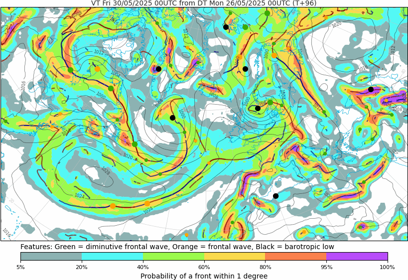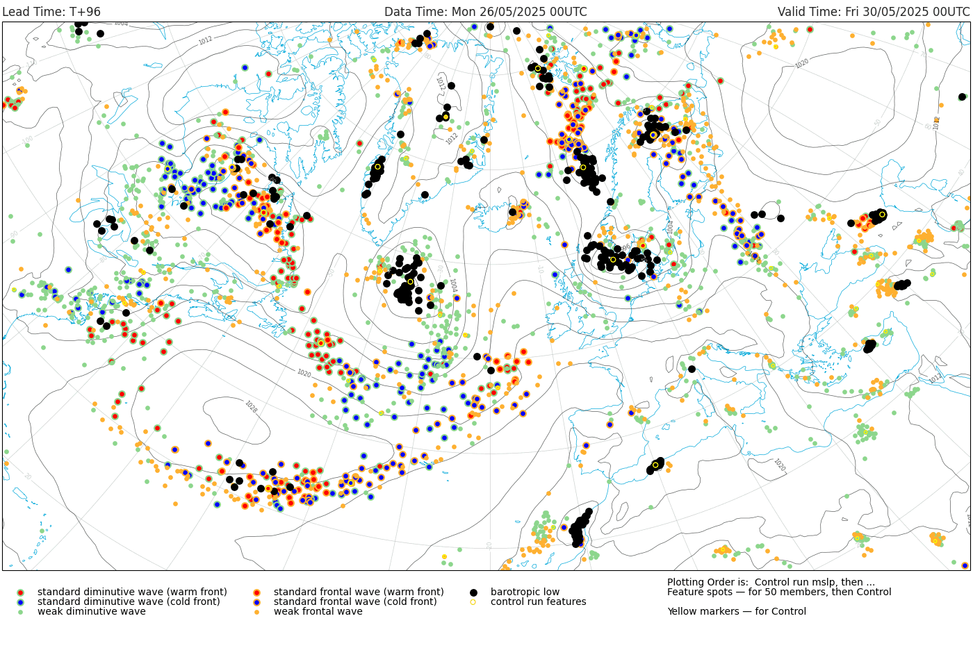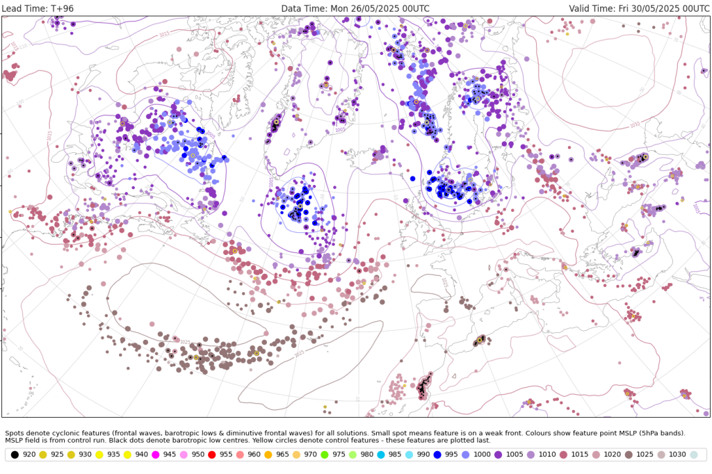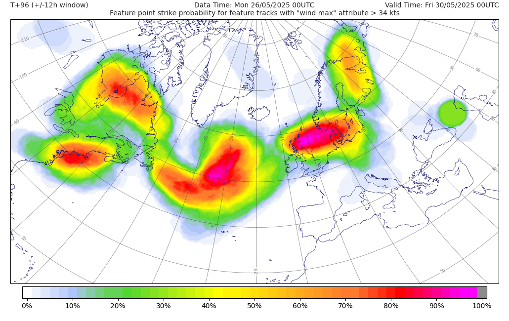 Voor vrijdag 30 mei zijn er enkele indicaties dat het onstuimig kan worden in het noorden van Nederland. De PASCAL-kansen (EPS-based 00z) liggen rond 60% voor zware windstoten van ≥75 km/u en 25% voor zeer zware windstoten van ≥100 km/u. De oorzaak lijkt verbonden te zijn aan een gesimuleerde kleinschalige extratropische cycloon. Hoewel de andere NWP-modellen hier (veel) minder overtuigend mee zijn, laten verschillende ensembleleden van ECMWF deze optie wel zien. Een significante hoeveelheid aan ensembleleden laten in ieder geval de luchtdruk zakken naar 995-1.000 hPa in de kern van het virtuele systeem en simuleren de ontwikkeling van een windveld, waardoor het signaal niet te negeren is. Aangezien het om een situatie gaat die +96h ver weg is, zijn er inherente onzekerheden (ontstaan van het barotropische laag, track, mate van cyclogenese en andere mesoschale processen) verbonden aan deze potentiële ETC.