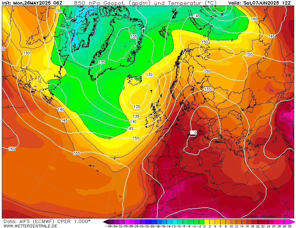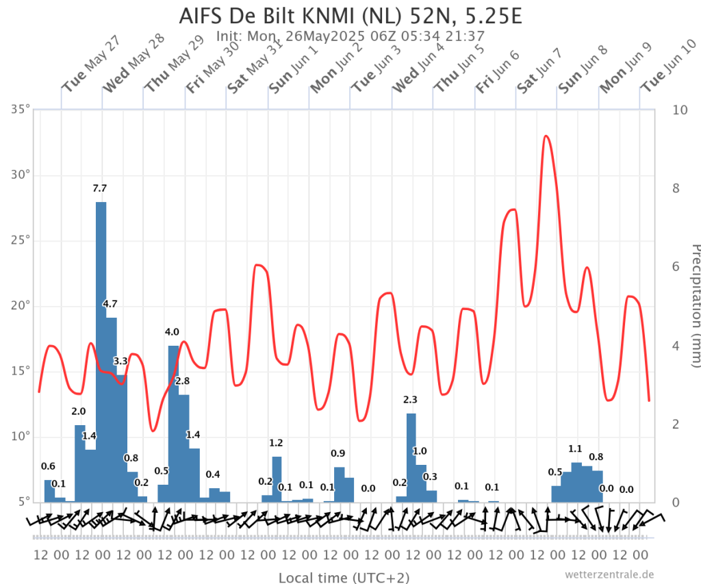Ik blijf toch bijzonder vinden dat dit in zijn geheel niet terug te zien is in de ECMWF pluim (met een goed getraind oog zijn er net aan 2 nipte zomerse lijntjes te ontdekken voor 7 juni), terwijl het AI model van ECMWF er inmiddels al wel meerdere runs in meer of mindere mate mee komt rond die tijd. Na 7 juni tijdelijk wat frisser door een wisseling van de wacht van hogedrukkernen. Onderstaand het diagram voor De Bilt en de 850hPa kaart voor 7 juni, waarbij de 20°C op dat niveau over België ligt.