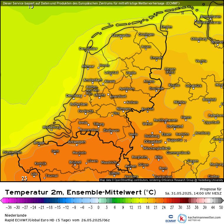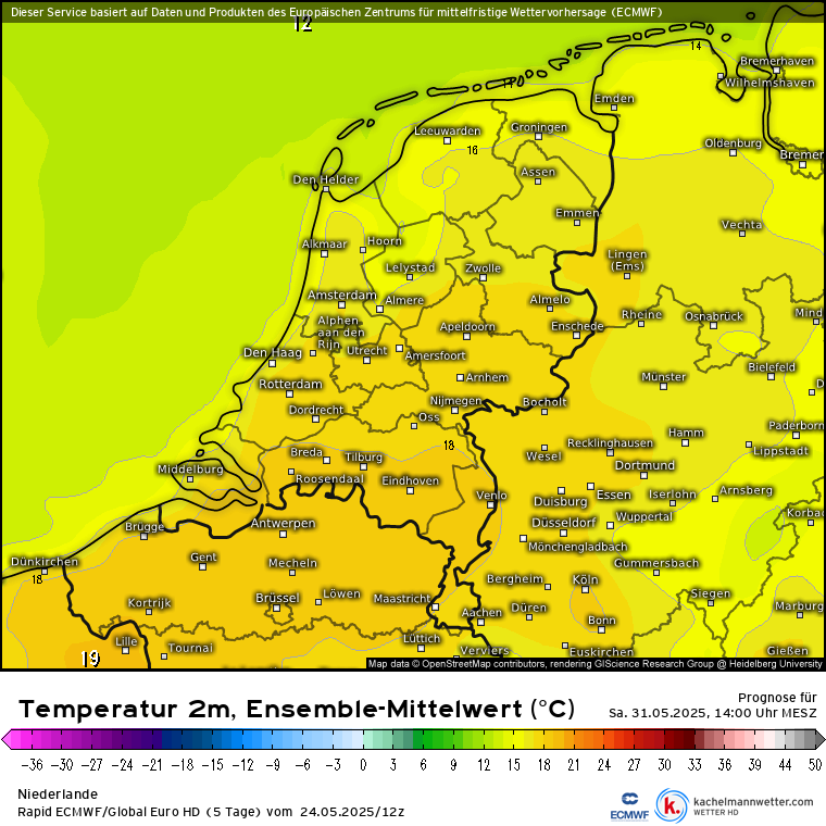 Waar de run van 24 mei (12z) voor temperaturen tussen 16-19 graden koos, is dat in de meest recente run voor 31 mei al gestegen naar meer 20 graden in een groot deel van de Benelux. Toch een vrij grote wijziging op een 7 dagen vooruit.