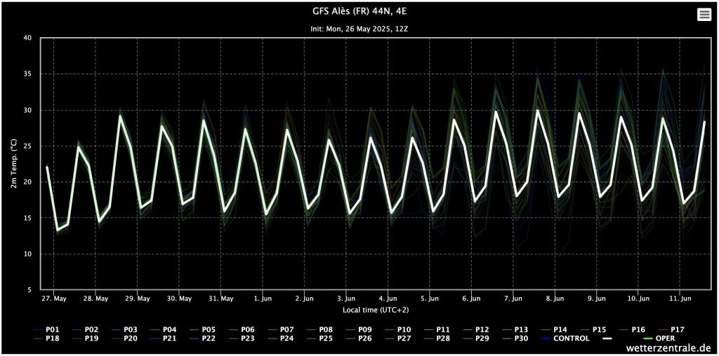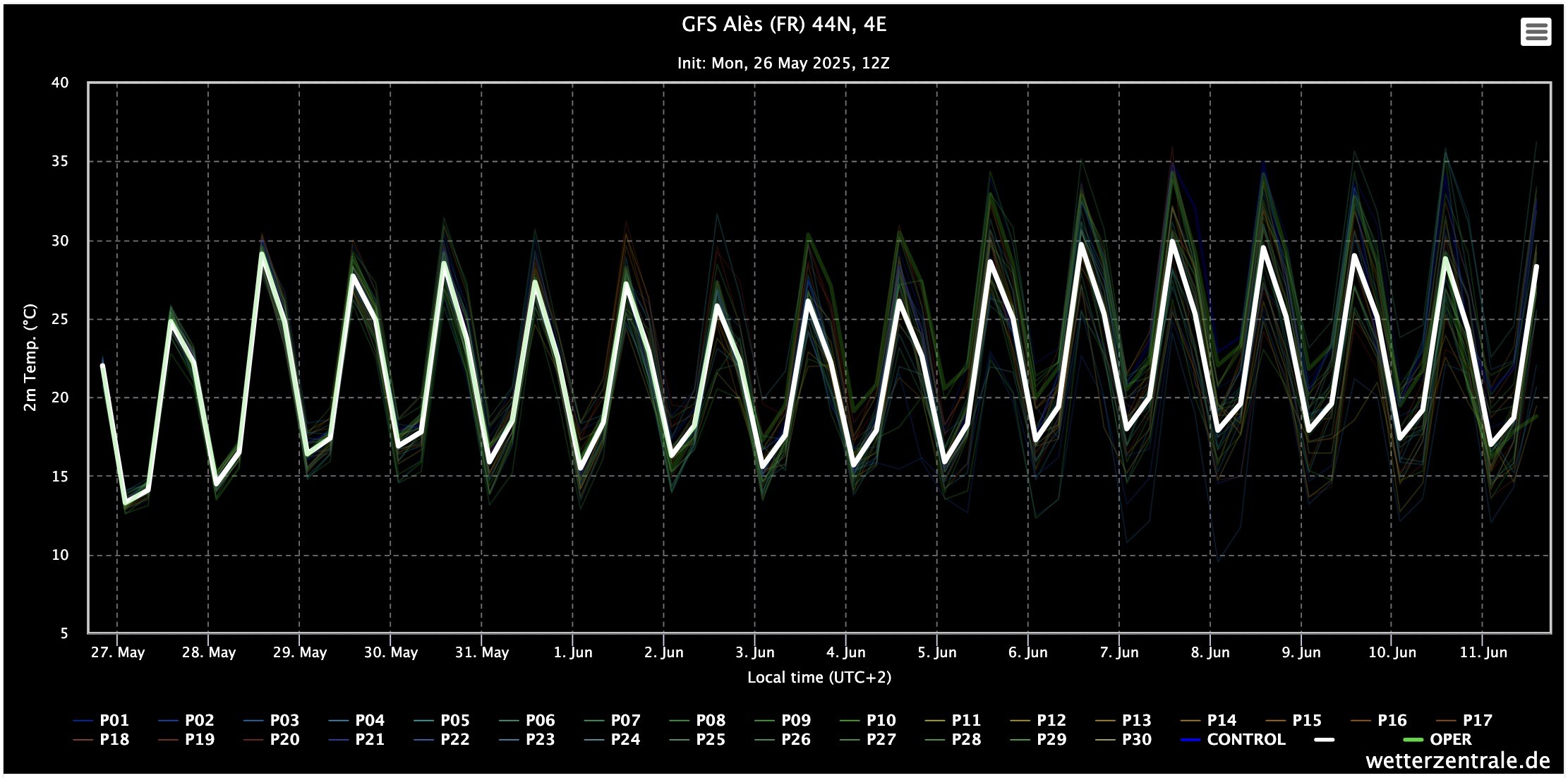 Echt heet zou ik het niet noemen. Tuurlijk, een gemiddelde van rond de 30ºC is hoog, maar bij heet denk ik voor die regio aan 35ºC+. Daarnaast ligt het dauwpunt over de gehele lijn ook relatief laag, dus voor die omgeving heerlijke omstandigheden. Beter dan richting de 40 graden.