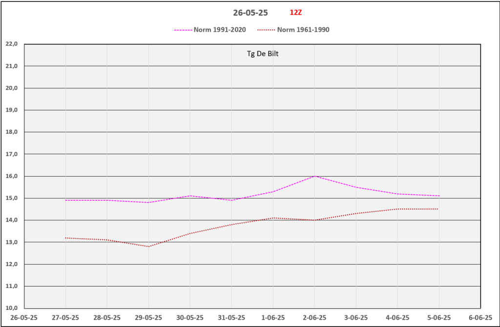 Daar zie je het klimaatgemiddelde voor de komende 10 dagen van 1961-1990 versus 1991-2020.
