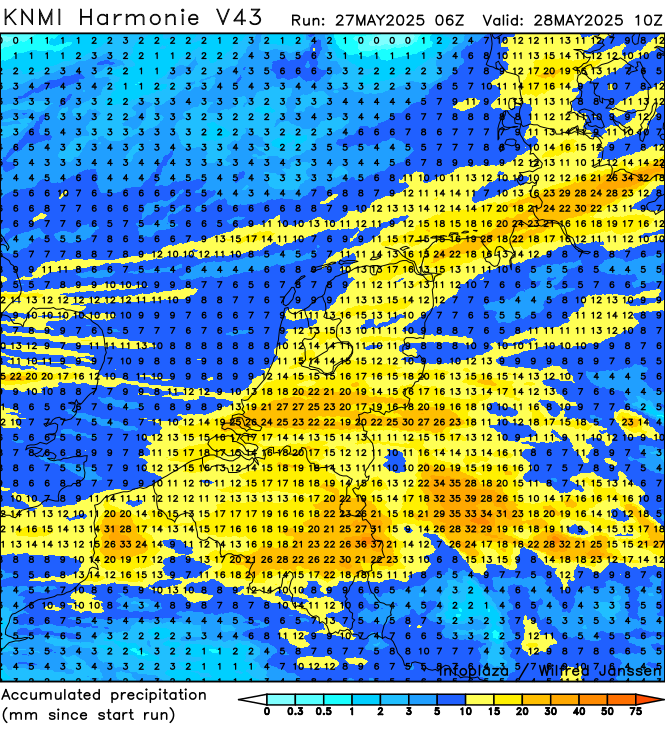 Vanochtend viel er 5 mm regen, nu is het droog en komt de zon er een beetje door. Later vanmiddag wordt het weer kletsnat en valt er mogelijk meer dan 20 mm regen in deze omgeving tm morgenochtend.