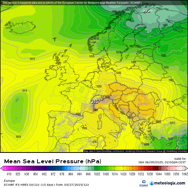 Met de nodige disclaimers dus, maar ECMWF is wel écht heet op termijn. Bovenluchttemperaturen (850 hPa) tot 26 graden in Frankrijk, en 22 graden in het zuidoosten van de Benelux bij de eerste 'push' van warmte. De aanvoer van beduidend warmere lucht start zo rond 9 juni in deze uitvoer.