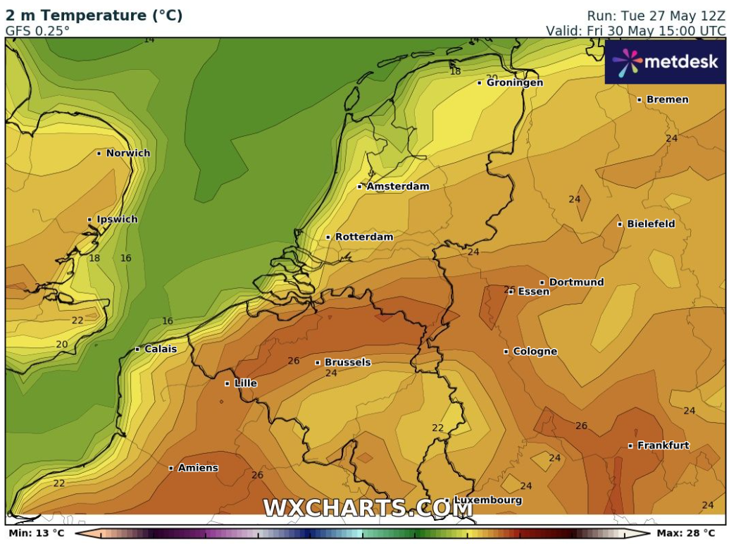 en zo trekt het model naar GFS die dit al dagenlang intekent. Ook zaterdag en zondag zijn zomers warm in het binnenland, iets minder richting kust maar zeker niet slecht!