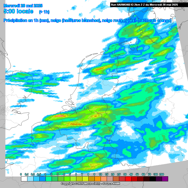 Als je de huidige harmonie run bekijkt zou er in een groot deel van België (en NL) op dit moment stevige regen moeten vallen. Plaatje laat de 1 uurs sommens zien. Maar de actualiteit laat een ander beeld zien (zie buuenradar plaatje). Waarbij het zo goed als droog is in een groot deel van NL en BE Jammer want had een mooie som op kunnen leveren. Hopelijk klopt de rest beter en valt er vanmiddag nog wat .