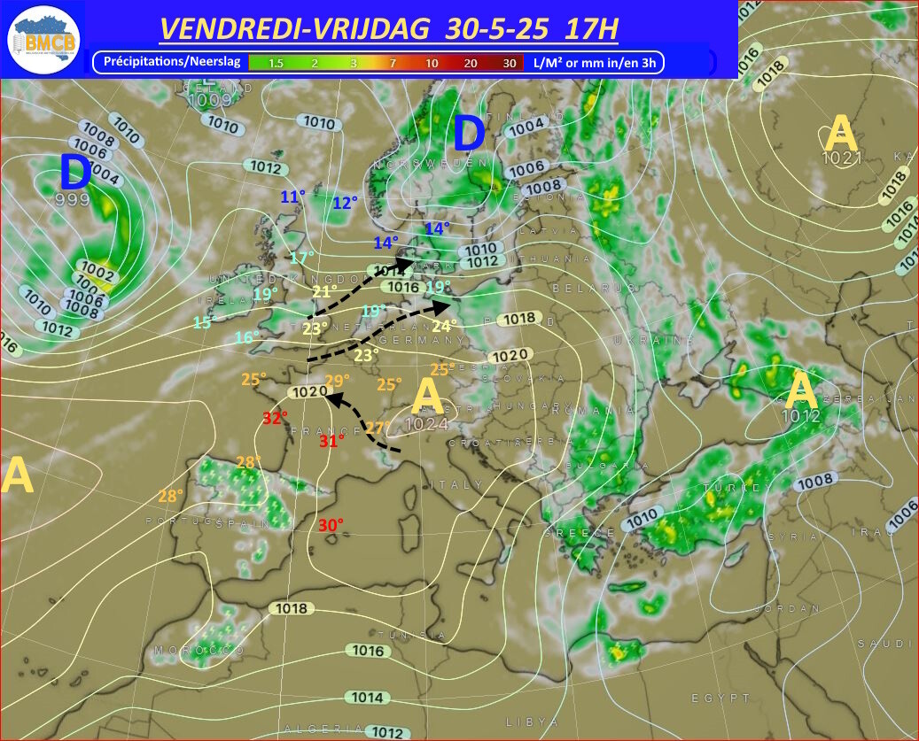 Op vrijdag verplaatst dit hogedrukgebied zich naar de Alpen, wat de aanvoer van zeer zachte, plaatselijk zelfs warme lucht over Frankrijk bevordert. In onze streken wordt de luchtmassa droger en uitzonderlijk zacht voor de tijd van het jaar. Vanaf zaterdag ontstaan er echter onweersbuien boven Frankrijk en Duitsland, die het weer in het zuiden en oosten van het land zullen beïnvloeden met plaatselijke buien of onweer.