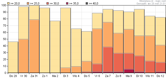 De kans op een zachte dag (15+) is zelfs wat groter dan de kans op een extreem warme dag (35+) voor 7 juni.