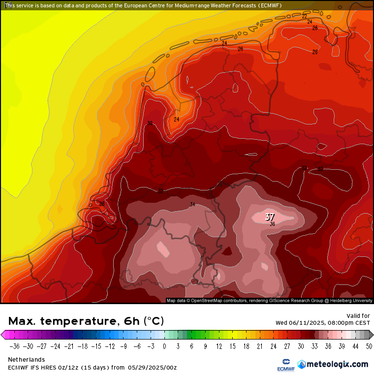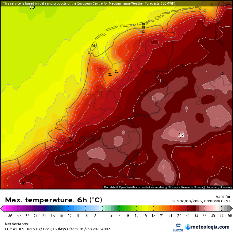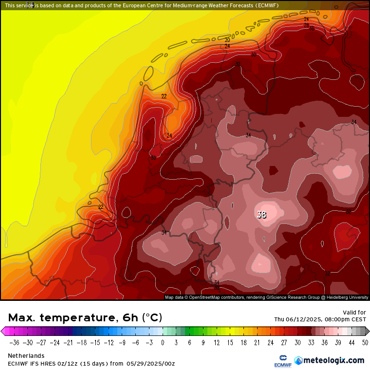 Meestal wel vrij grote verschillen tussen de kustgebieden en het binnenland, maar eigenlijk overal wel (zeer) warm. Hier de maximumtemperaturen volgens de ruwe uitvoer, werkelijke maxima kunnen vaak nog wel een graadje hoger uitpakken: