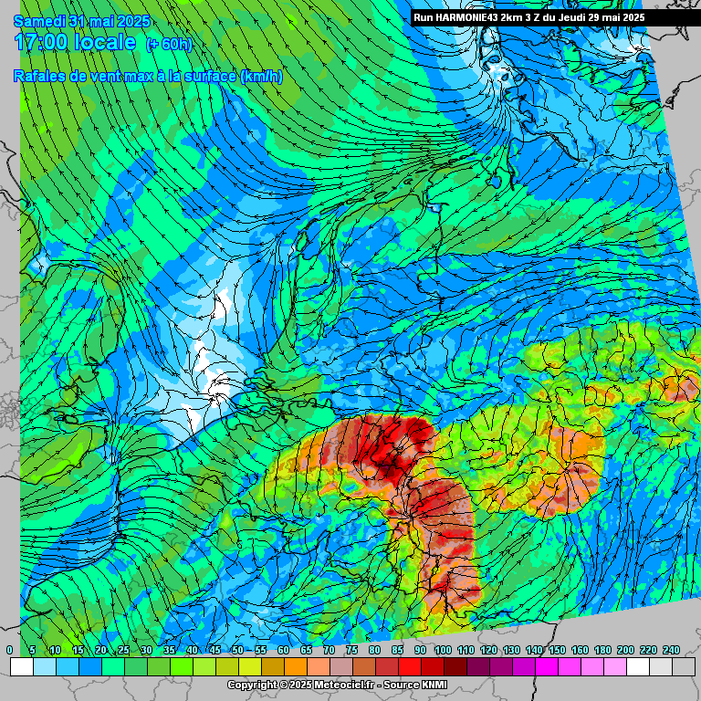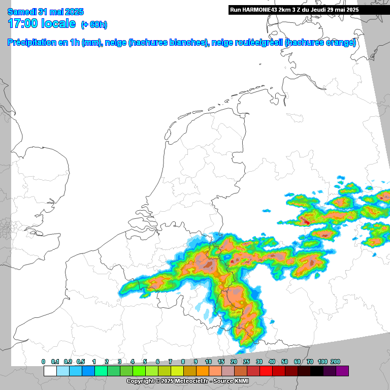 Inclusief (zeer) zware windstoten. Systeem komt vanuit Frankrijk binnen en breidt zich gedurende de middag steeds verder uit.