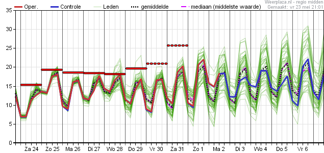 Maandag, dinsdag en donderdag (gisteren) kwam de maximumtemperatuur zelfs hoger uit dan de allerwarmste leden, op een enkele uitbijter na. Voor vandaag kwam één lid met nipt 20 graden in het midden van het land, terwijl ik verwacht dat de temperatuur met het oplossen van de bewolking nog wel stijgt tot zo'n 21 graden. Warmer dan het warmste lid 7 dagen geleden dus had voorzien. En morgen is het nog een tandje extremer: een week geleden was de warmste optie voor 31 mei zo'n 22 graden, terwijl het gewoon zomers warm zal worden.