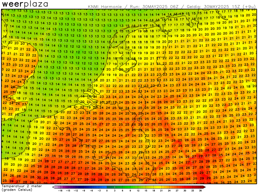 Bij jou vandaag mogelijk al zomers inderdaad. Hier kansloos, de zon is net een uurtje of anderhalf af en toe doorgebroken. En voorlopig klaart het niet verder op dan half bewolkt. Te weinig instraling hier om de 25°C te doorbreken vanmiddag. Ook Harmonie laat daar voor hier geen mogelijkheid toe.