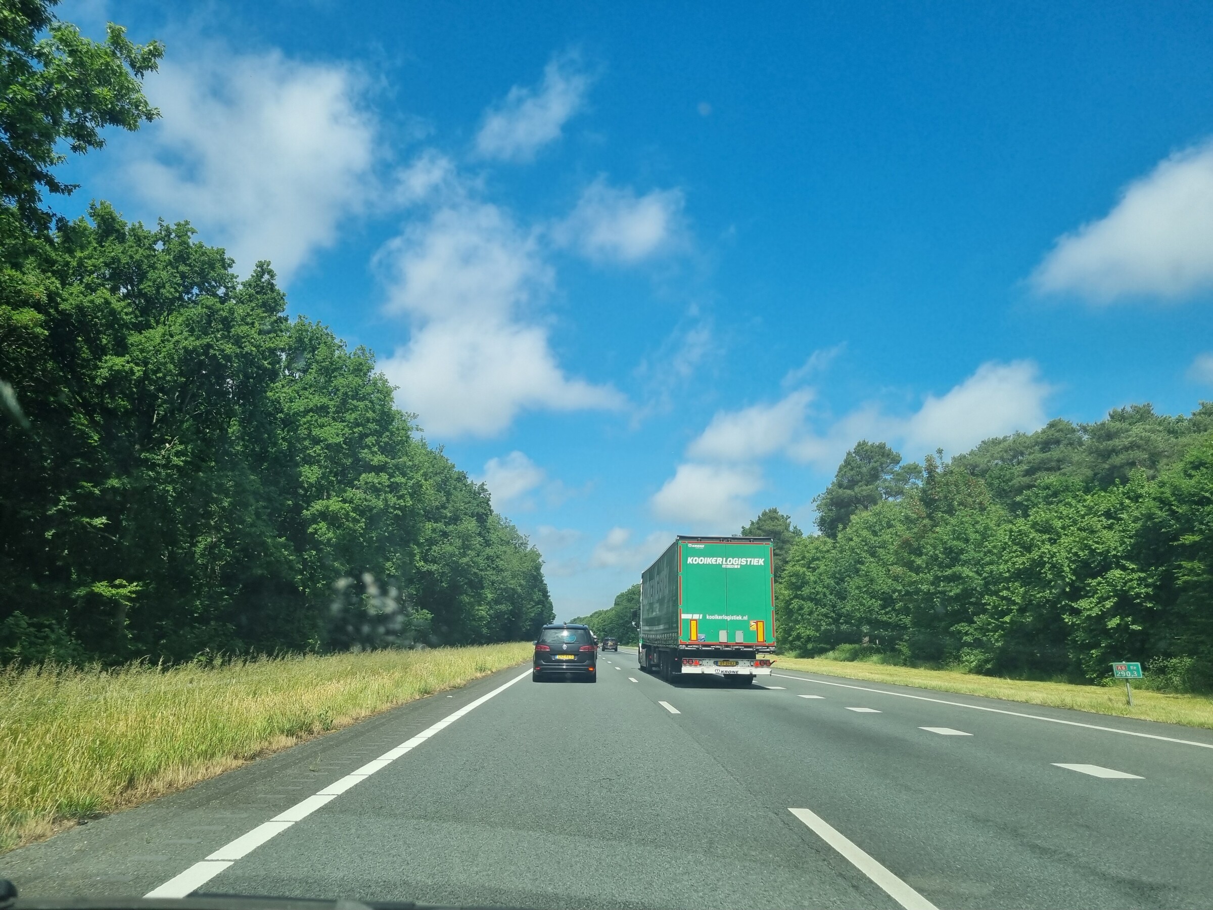 . Ik ben gek op hitte, maar dit is tot nu toe voor mij al een hele meevaller. Het voelt lekker warm aan, dus raampjes open als we weer van de snelweg af zijn