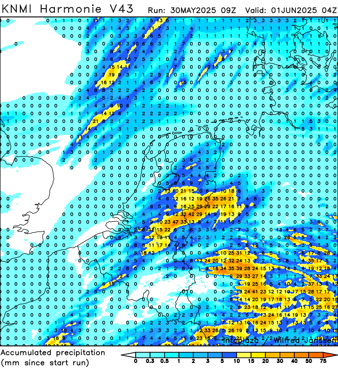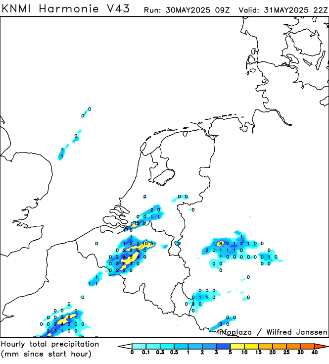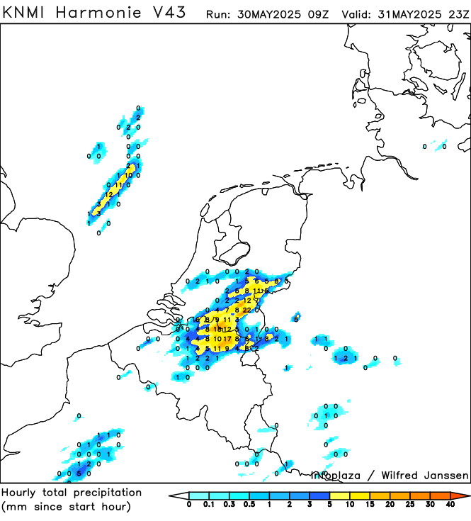 Volgens deze run ontstaan er in snel tempo stevige buien na middernacht in Noord-België en delen van Nederland. Intensiteiten tot 20-40 mm/uur. Idealiter zouden ze natuurlijk wat eerder ontstaan voor de onweerliefhebbers…