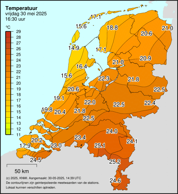 Hier in Oss ruim 24° afgaande op WoW.KNMI. Bij Herman zelfs een kille 14,9°...