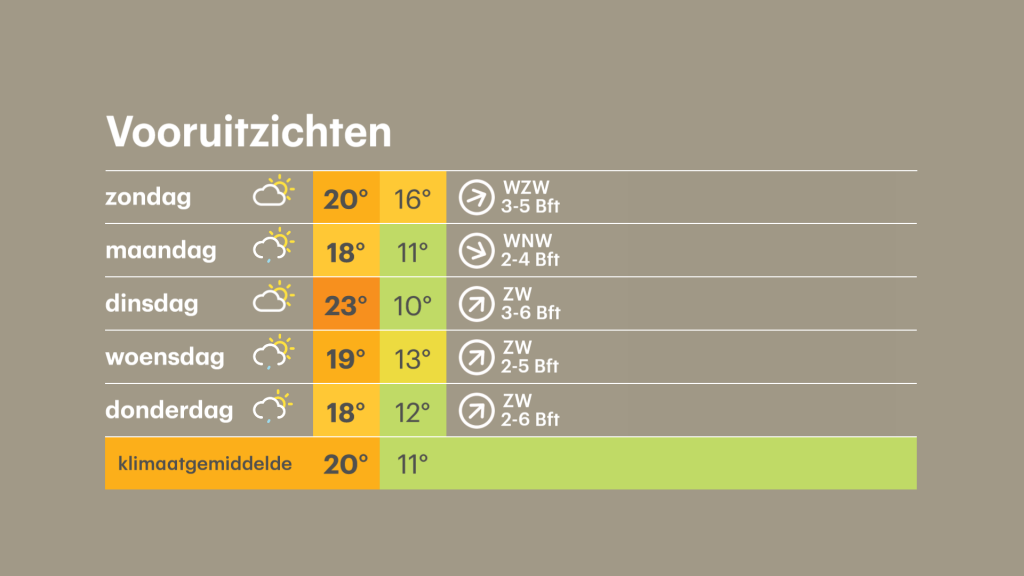 Vandaag natuurlijk een uitzondering met een stuk hogere temperaturen, vanaf morgen gaan we terug richting heel normale waarden voor de tijd van het jaar, in ieder geval overdag. Maandag ietwat aan de frisse kant, dinsdag juist weer wat warmer, maar al met al heel dicht rond het klimatologisch gemiddelde van 20 graden voor begin juni. Met een aanlandige wind zal er natuurlijk wel een verschil zijn tussen de kustgebieden en het binnenland.