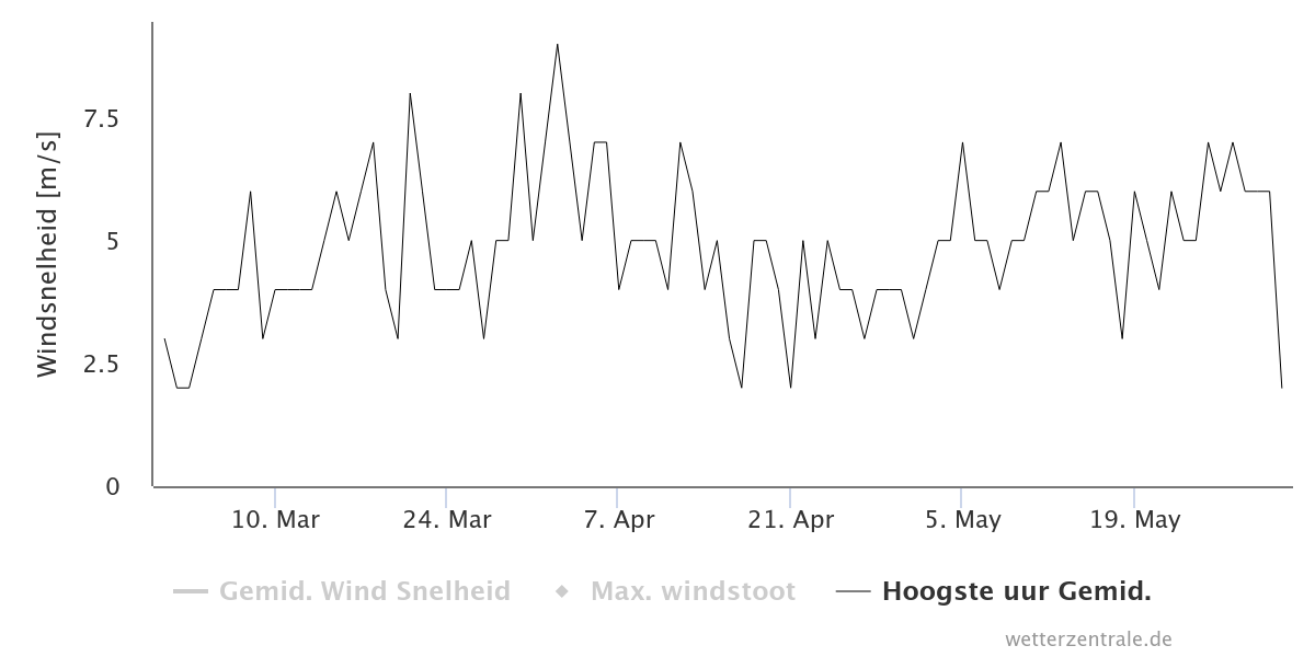 Als je dan kijkt naar de maximale uurgemiddelde wind per dag deze lente in De Bilt, dan is die 4 Bft slechts op 28 dagen gehaald (tegenover 42 dagen normaal). De afgelopen week trouwens wel op 6 van de 7 dagen. Windkracht 5 is zelfs maar op 3 dagen gehaald (tegenover 12 dagen normaal).
