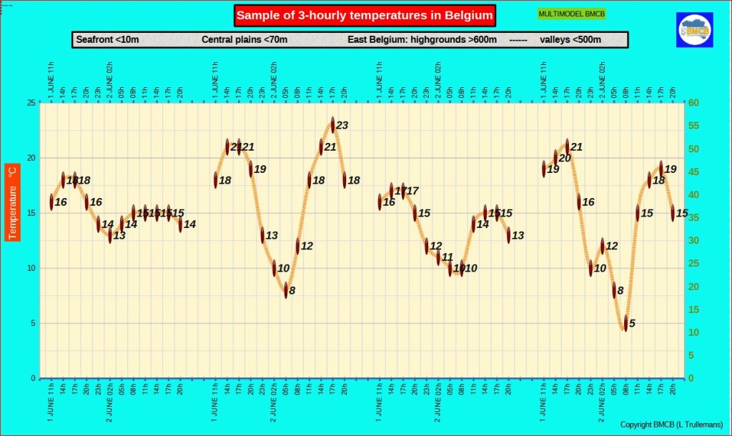 Minimale temperaturen : tussen 8 en 14°C, en 5 tot 8°C in de valleien ten zuiden van Samber en Maas.