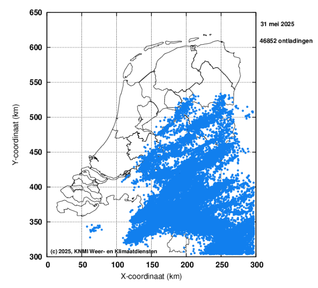 Bijna 47.000 ontladingen gisteravond en vannacht tot 00:00 UTC. Prima opbrengst voor de eerste serieuzere onweerssituatie in Nederland. Mooie afsluiter/aftrap van de meteorologische lente/zomer.