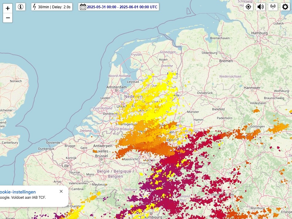 Aan deze kaart mooi te zien waar het onweer huis hield, ik zat nog op een webcam in Sittard te kijken maar trok daar te veel noordelijk langs.
