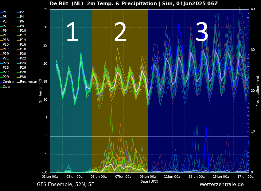 3) Eerst opbouw continentale rug, daarna steeds Azorenuitlopers. Zonniger, droger, warmer. Kans op continentale winden aanvoer neemt fors toe (40-50%).