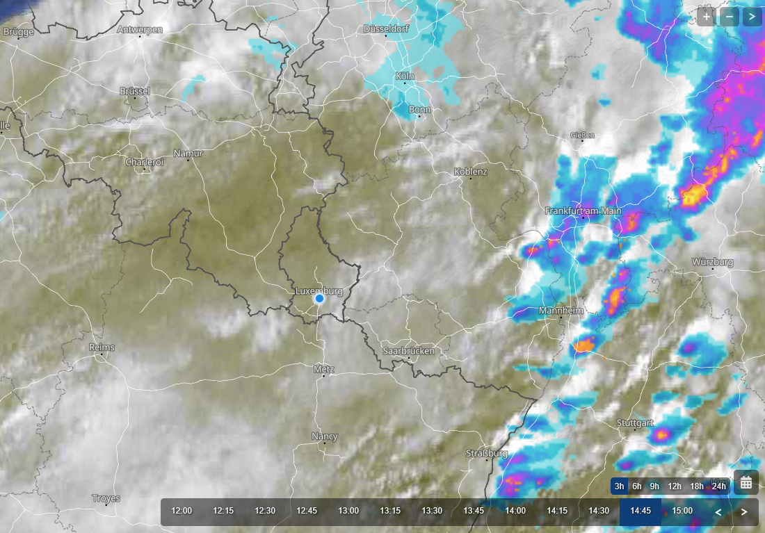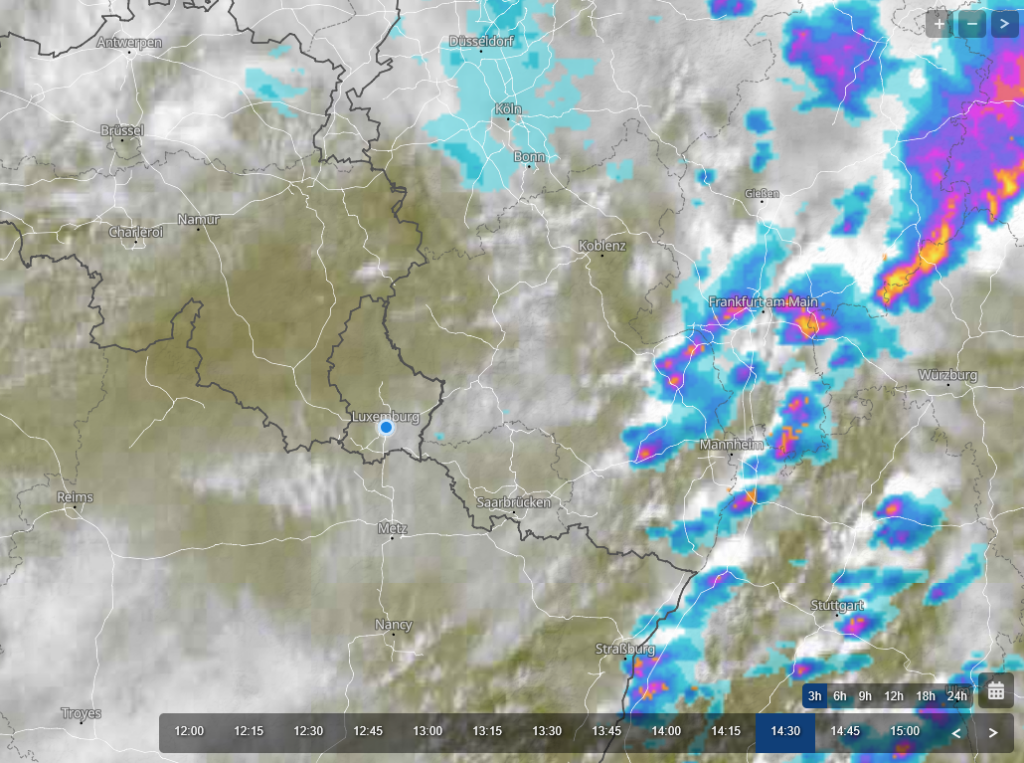 Hieronder eerst de beide satellietbeelden van 14:30 en 14:45. Het gaat dus om 14:30 om de wolk net ten noorden van Luxemburg. Verder naar het oosten zijn de zware buien te zien, die daar nu nog vallen.