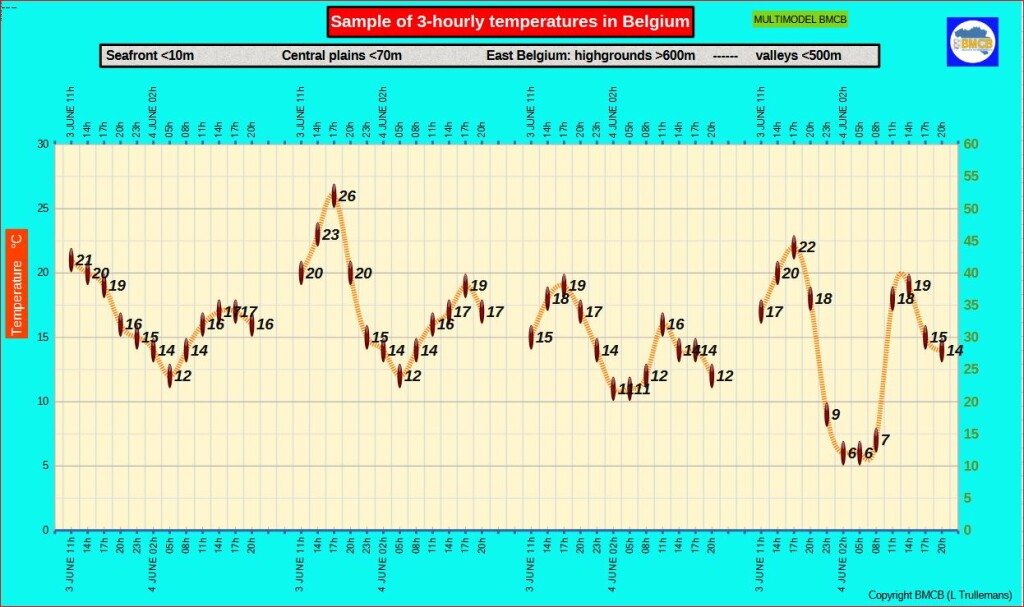 Minima: 12–16°C, 6–11°C in de valleien ten zuiden van Samber en Maas.