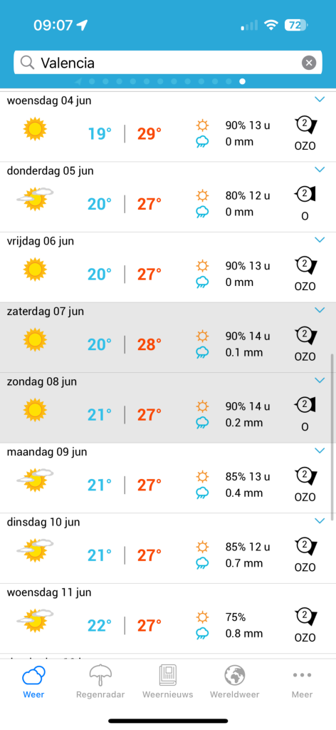 Valencia! Zie hier het weer voor die plek; dit is wat er op z’n minst verwacht wordt. Ik hoop ook altijd op een Ojmjakon winter haha.