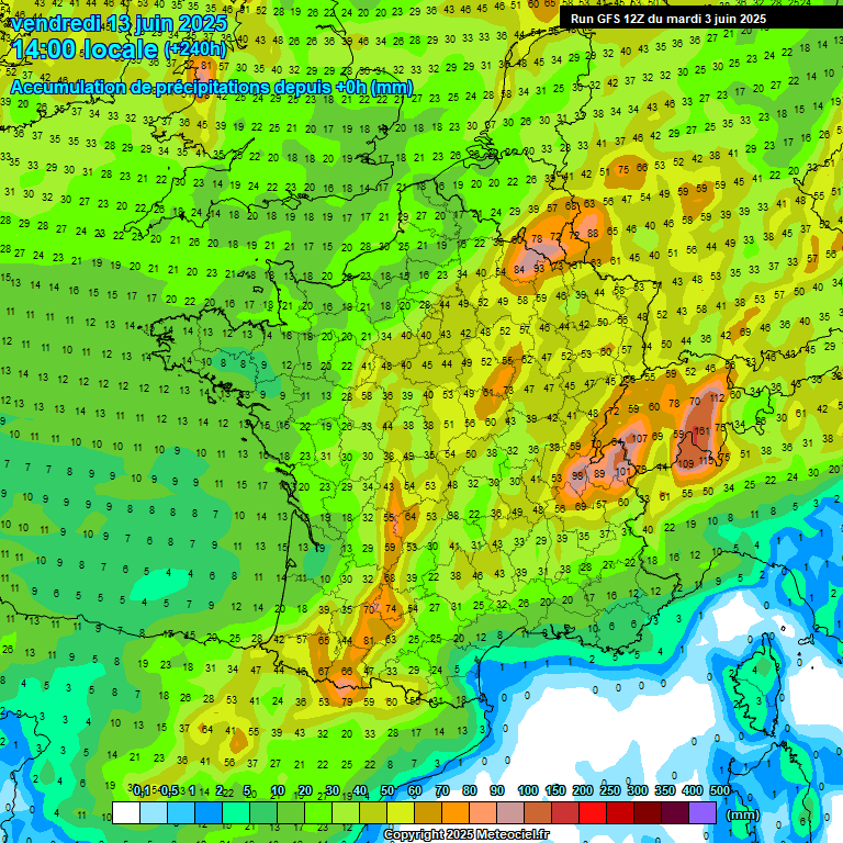Tot twee keer toe komt een golfje met tamelijk veel neerslag over het zuidoosten van de Benelux, met precies een week tussenruimte, dus beide keren van donderdag op vrijdag. Dat resulteert in een neerslagtotaal over 10 dagen to ruim 70 mm!