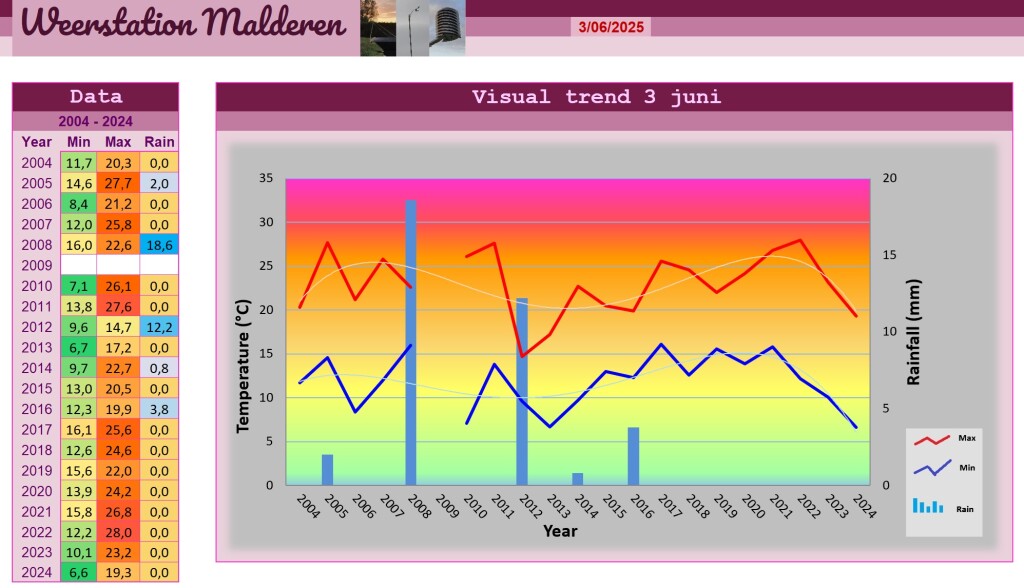 Ook vandaag kregen we weer met stevige windvlagen af te rekenen al was het vanochtend niet meer zo koud met minima van 13,8 graden. De wind trok snel aan naarmate de zon steeg en uiteindelijk werden er snelheden tot 33,8 km/h opgemeten uit het noordoosten. De temperaturen deden het nog beter dan gisteren met maxima van 27,6 graden en ook de avond verliep erg zacht maar winderig terwijl er veel sluierbewolking langs dreef uit een naderend warmtefront. Omstreeks 22H30 viel de wind plotsklaps als bij toverslag weg en werd het een erg zwoele en aangename zomeravond waarin we het minder aangename neerslagtotaal van 0,0 mm aflazen.