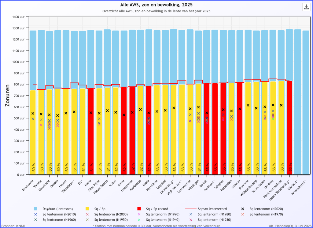 Ik ga ervan uit dat het KNMI de validatie van mei nu heeft afgerond. Voorschoten (0,2 uur tekort) en nog een aantal andere stations (Twente, Hupsel en Leeuwarden) grepen net naast een nieuw record.