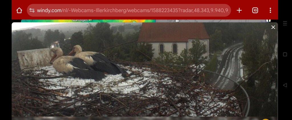 De ooievaars nabij Ulm zitten alleszins in de hagel (ook op de wegen op de achtergrond trouwens)