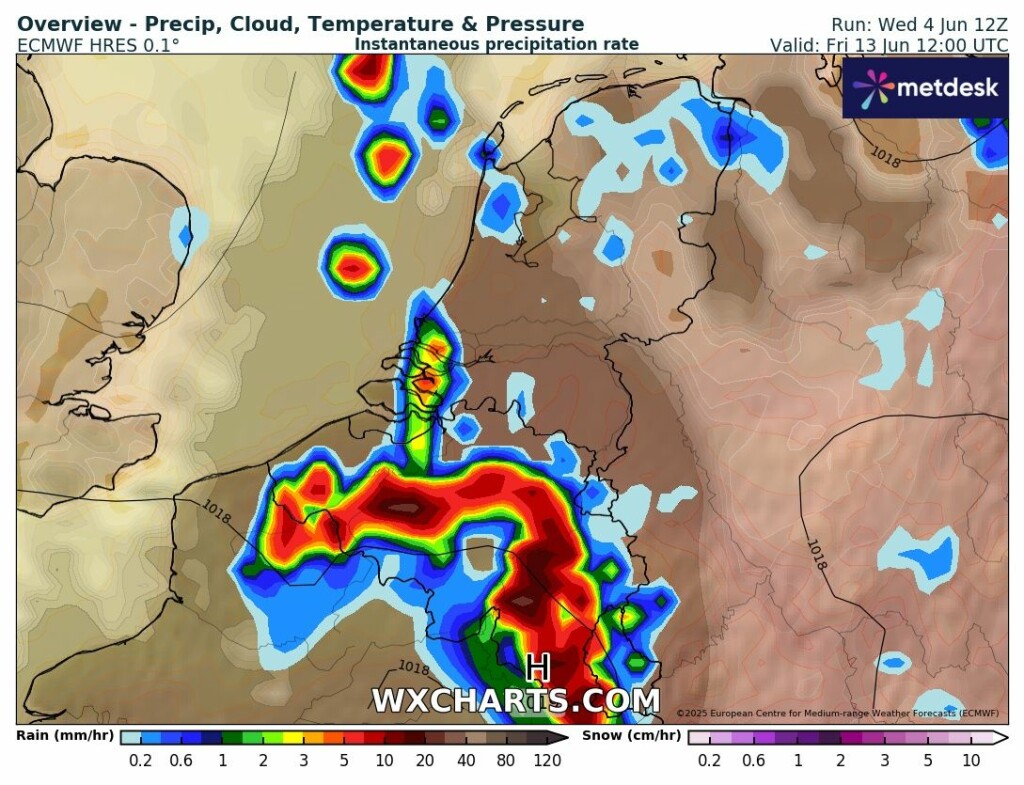 Warmste lucht bereikt ons in de nacht van woensdag/donderdag, waardoor het donderdag nog lijkt mee te vallen met het tijdelijk warmteopstootje. Dag nadien al direct gevolg door (onweers)buien. Geen langdurige stabiele warmte in deze oper run, laat staan hitte.