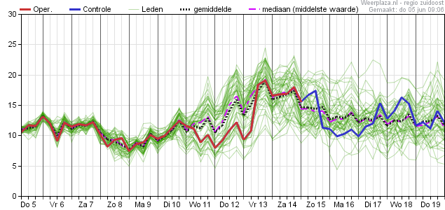Is dat het doorgaans wel een stuk vochtiger is/moet zijn, met hogere dauwpunten. Dat zie je ook terug in de dauwpuntpluim, die voor het zuidoosten toch richting de 20 graden gaat. Zelfs met 'slechts' zomerse temperaturen van 25 - 29 graden zal het dan flink benauwd kunnen aanvoelen.