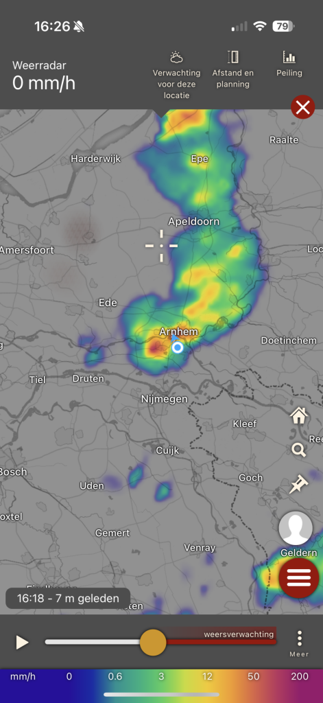 Maar zoals vaak trekt het zwaarste deel hier net ten noordwesten langs (oa over het centrum). Hier hooguit even matige regen. Wel donders te horen