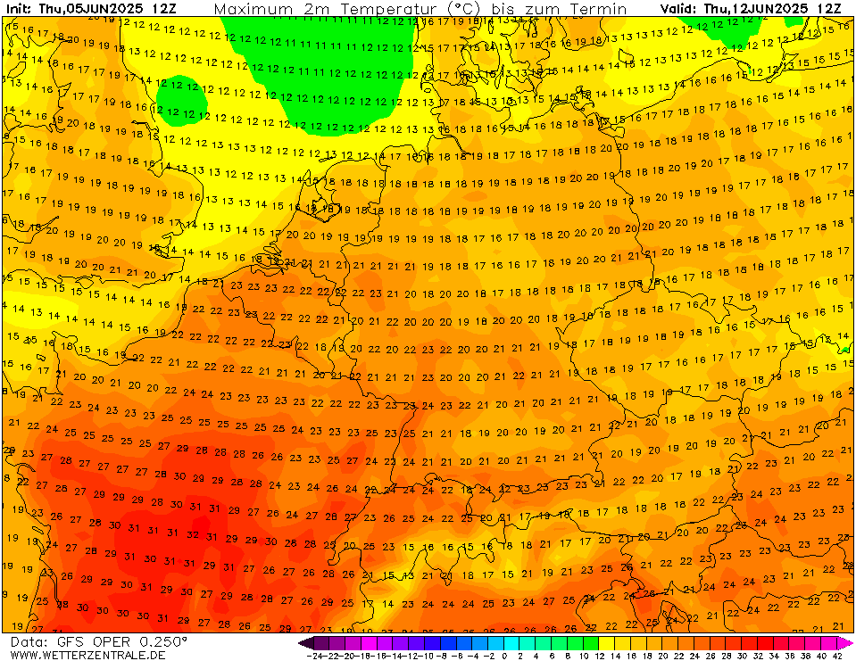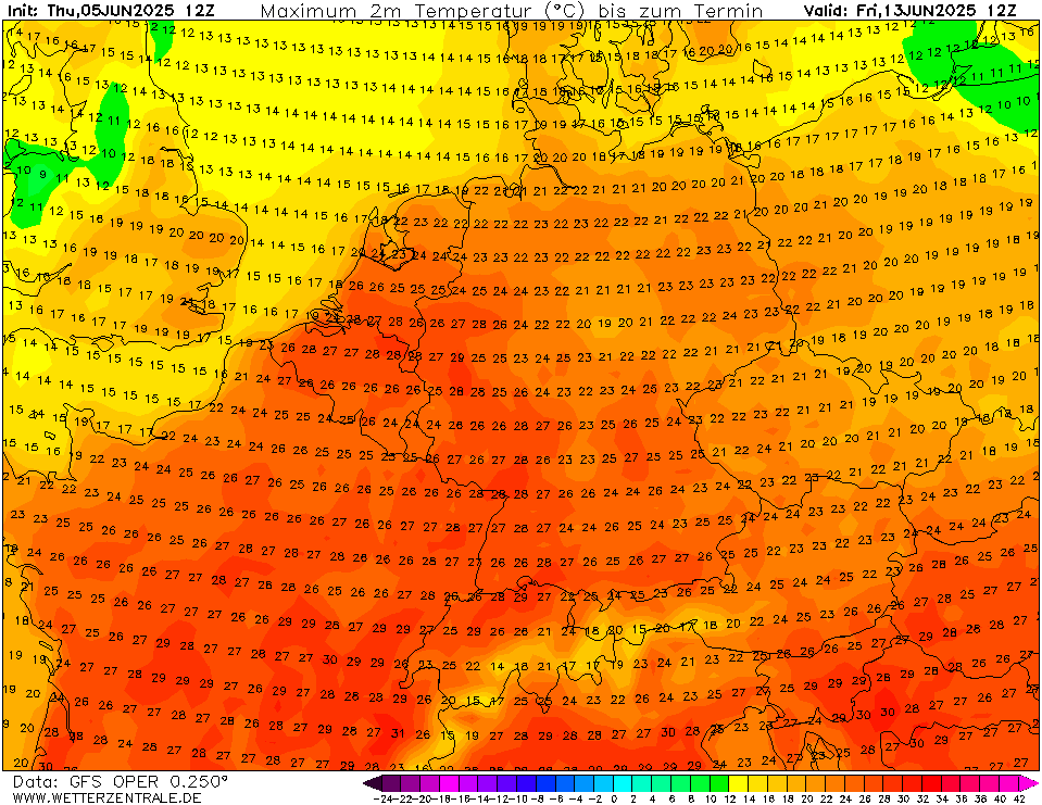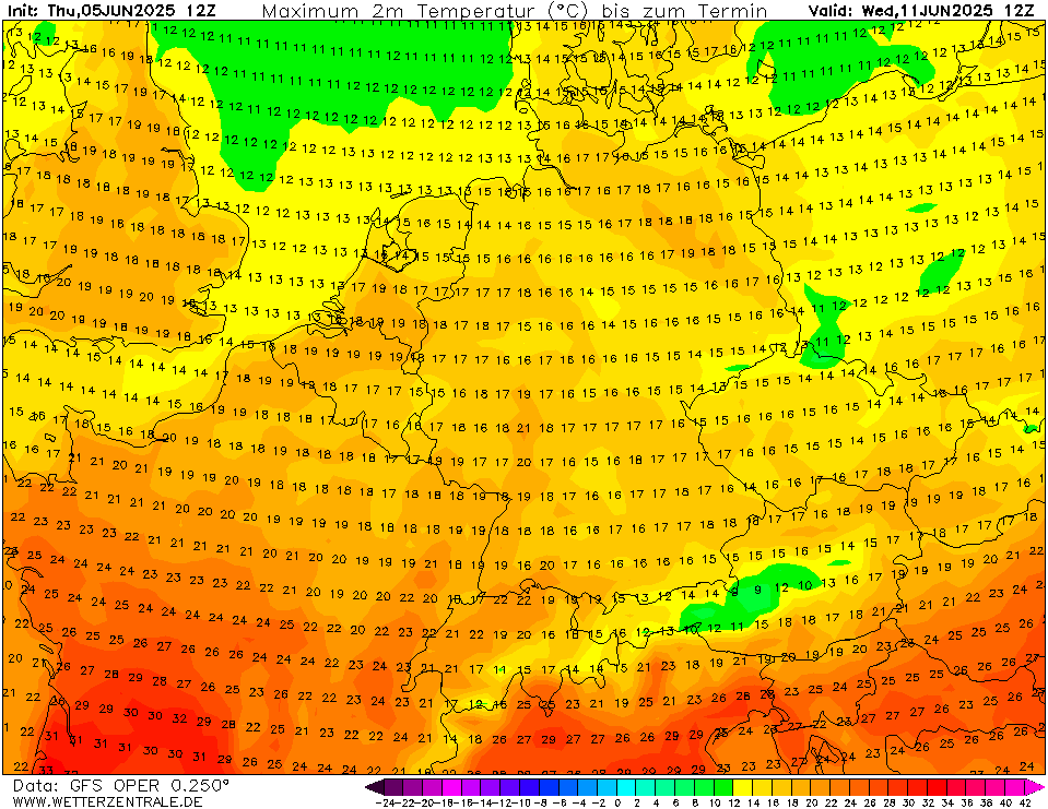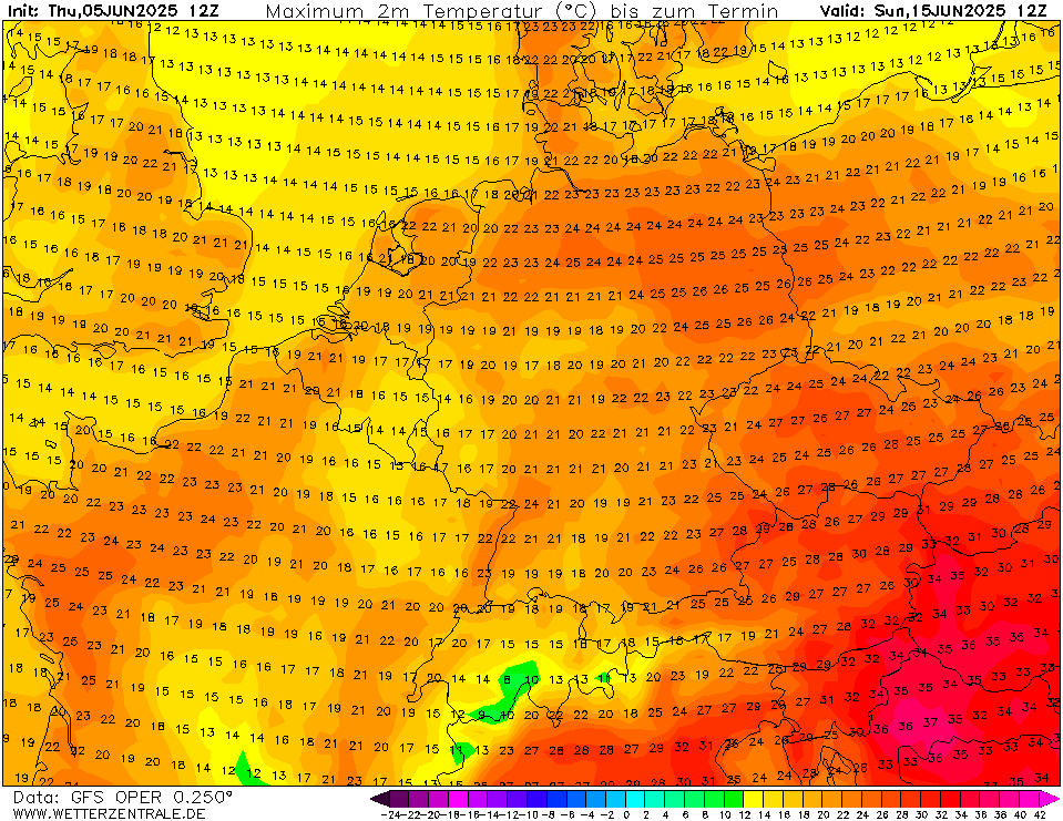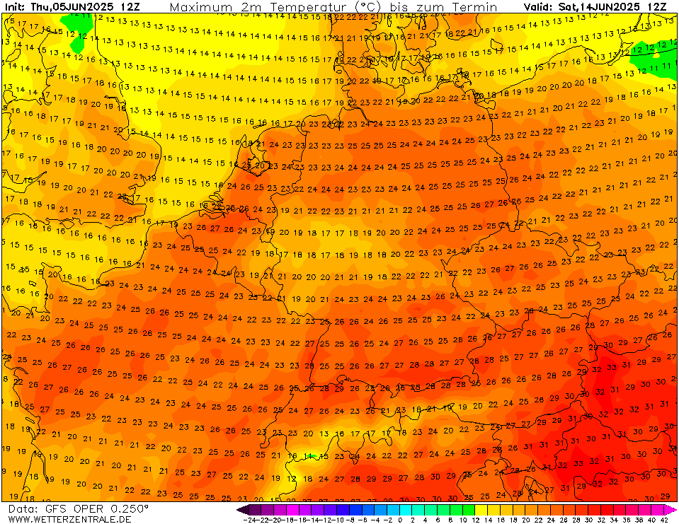 Een zomerse dag, zaterdag in een strook over het midden van Nederland ook en daarna is het alweer terug koeler. Woensdag in deze run koeltjes in plaats van zomers warm zoals GFS eergisteren liet zien.